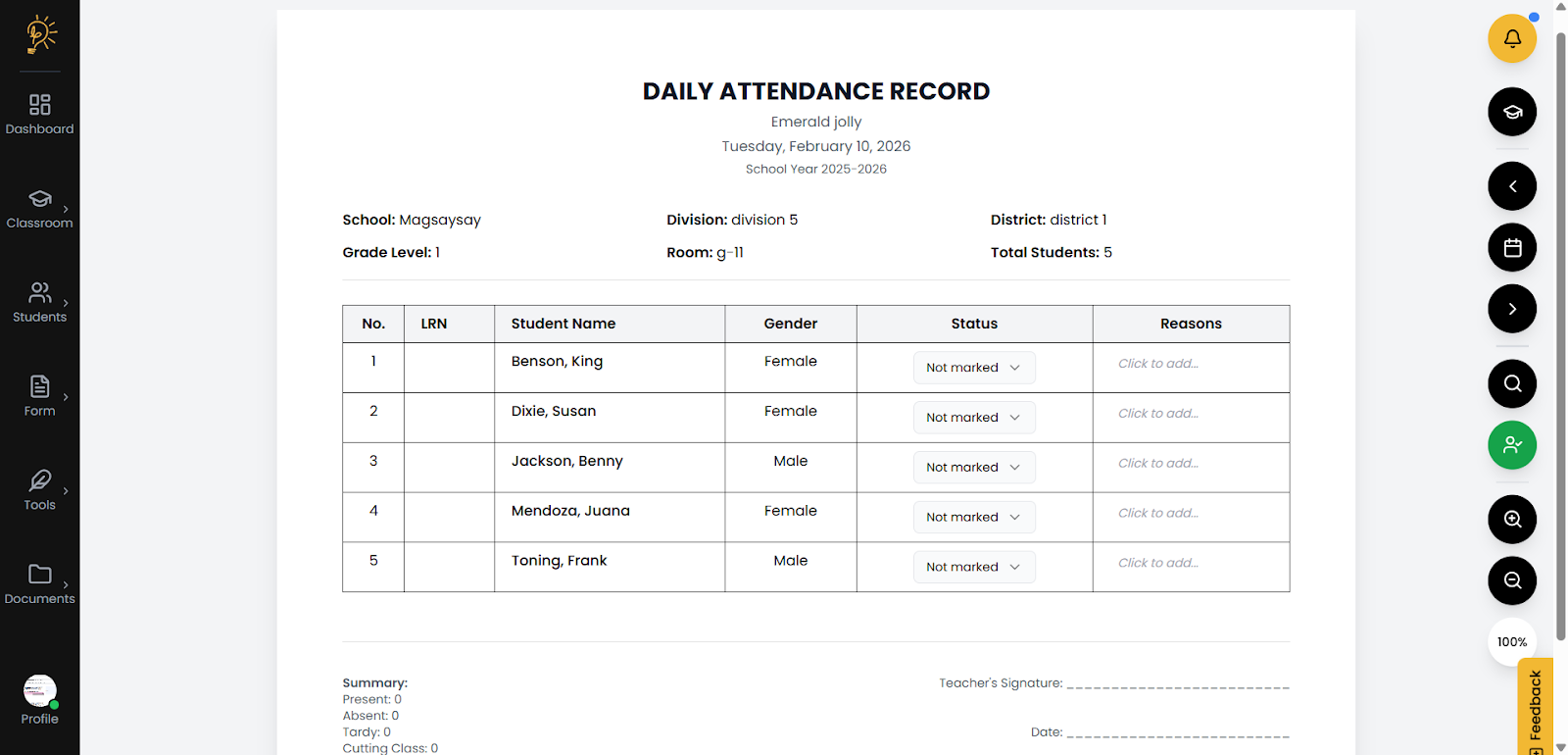 Some digital school systems allow teachers to record attendance electronically. These systems automatically compute totals and generate DepEd-formatted attendance reports.