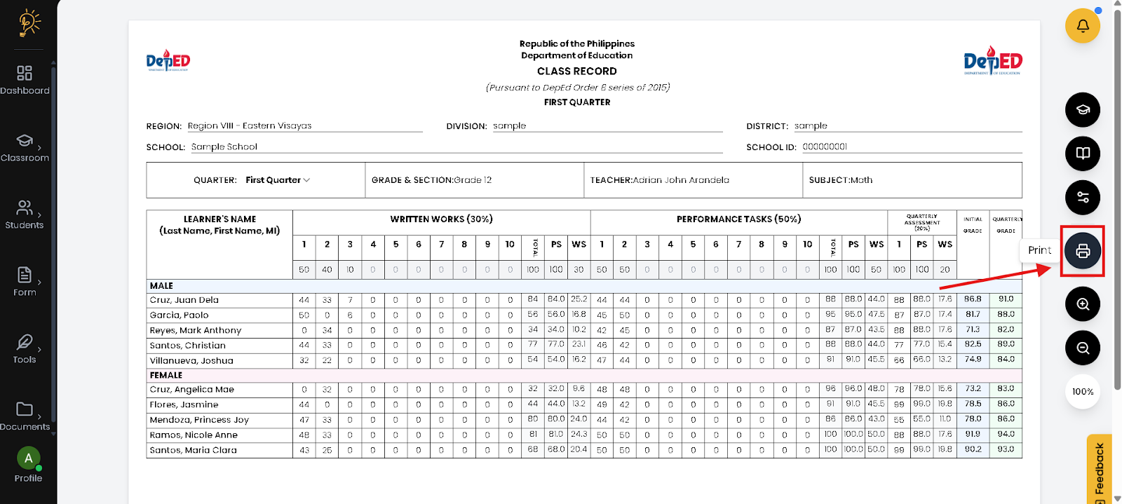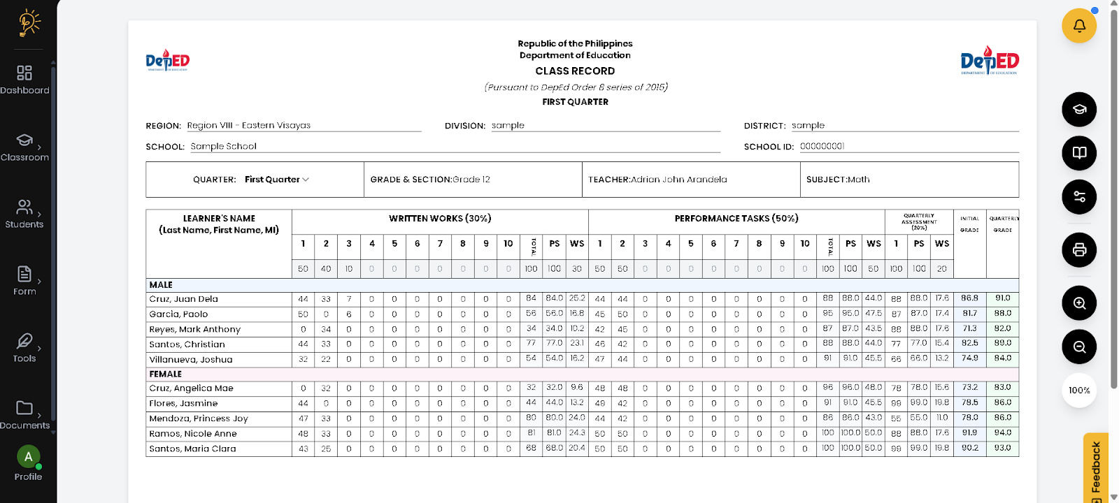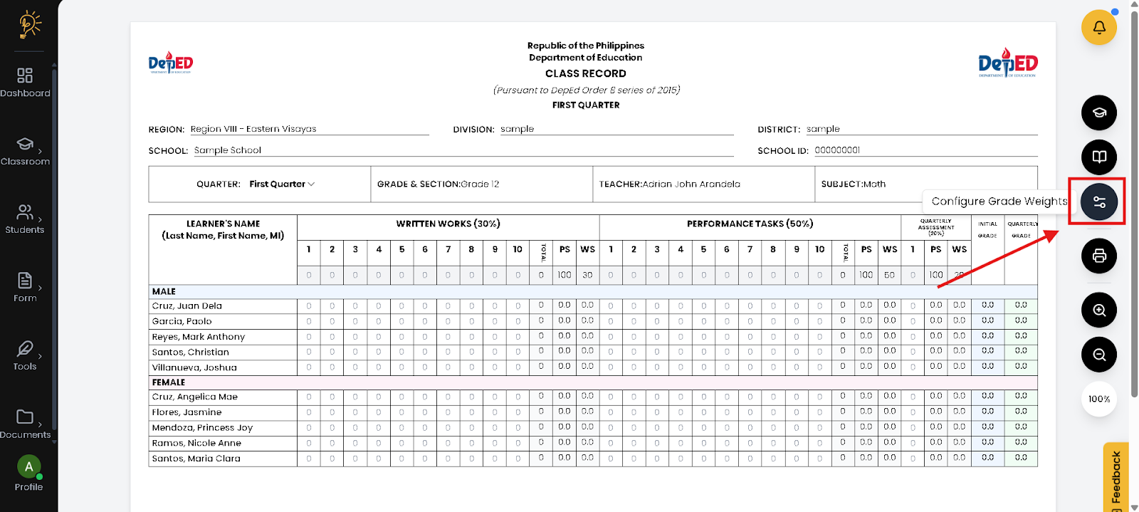 Using the on-screen buttons to switch classrooms and switch subjects, the class record updates instantly with the correct students and grading sheet. You can Configure grade weights, zoom in or out for easier viewing, and click Ready to Print to generate a DepEd-formatted class record—all without leaving the page.