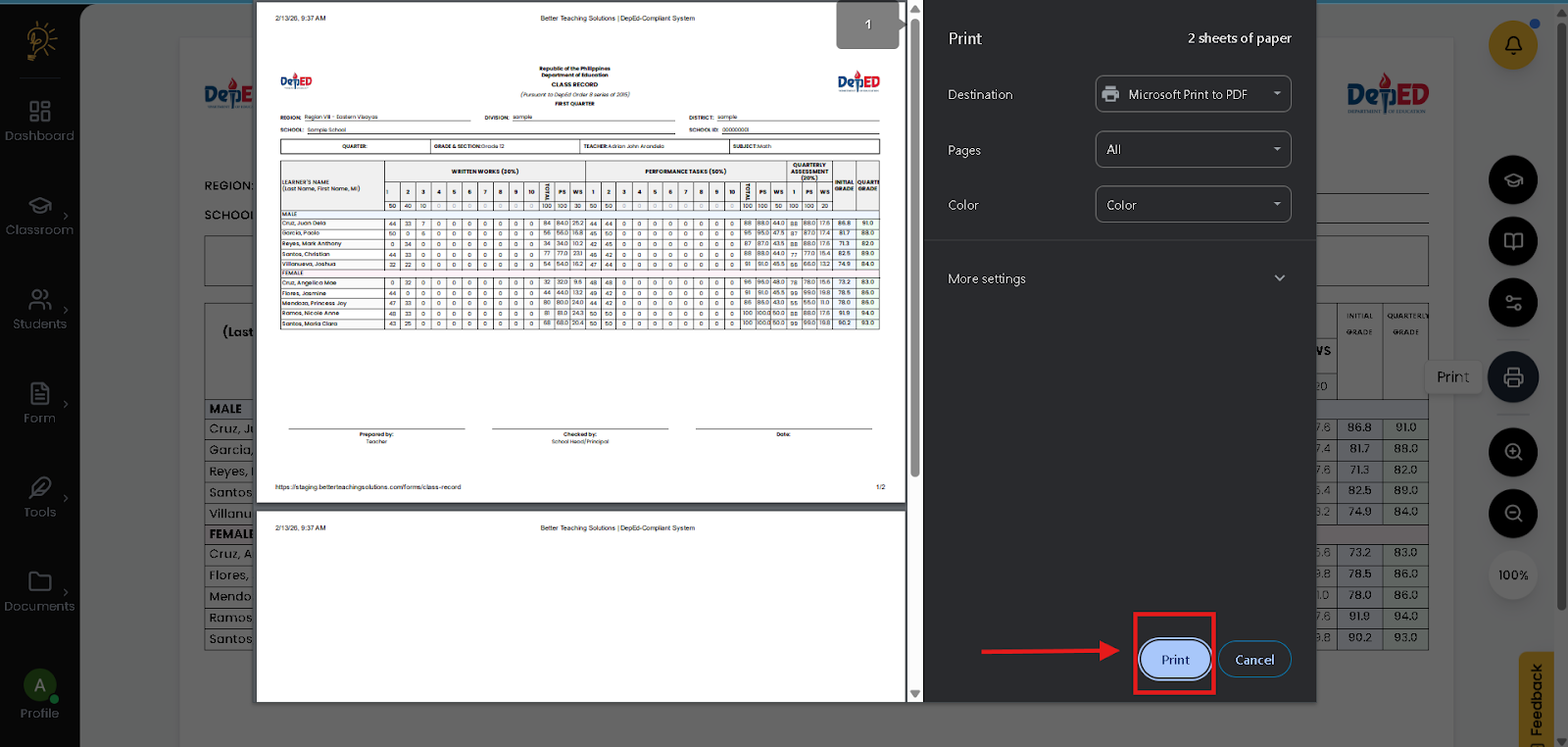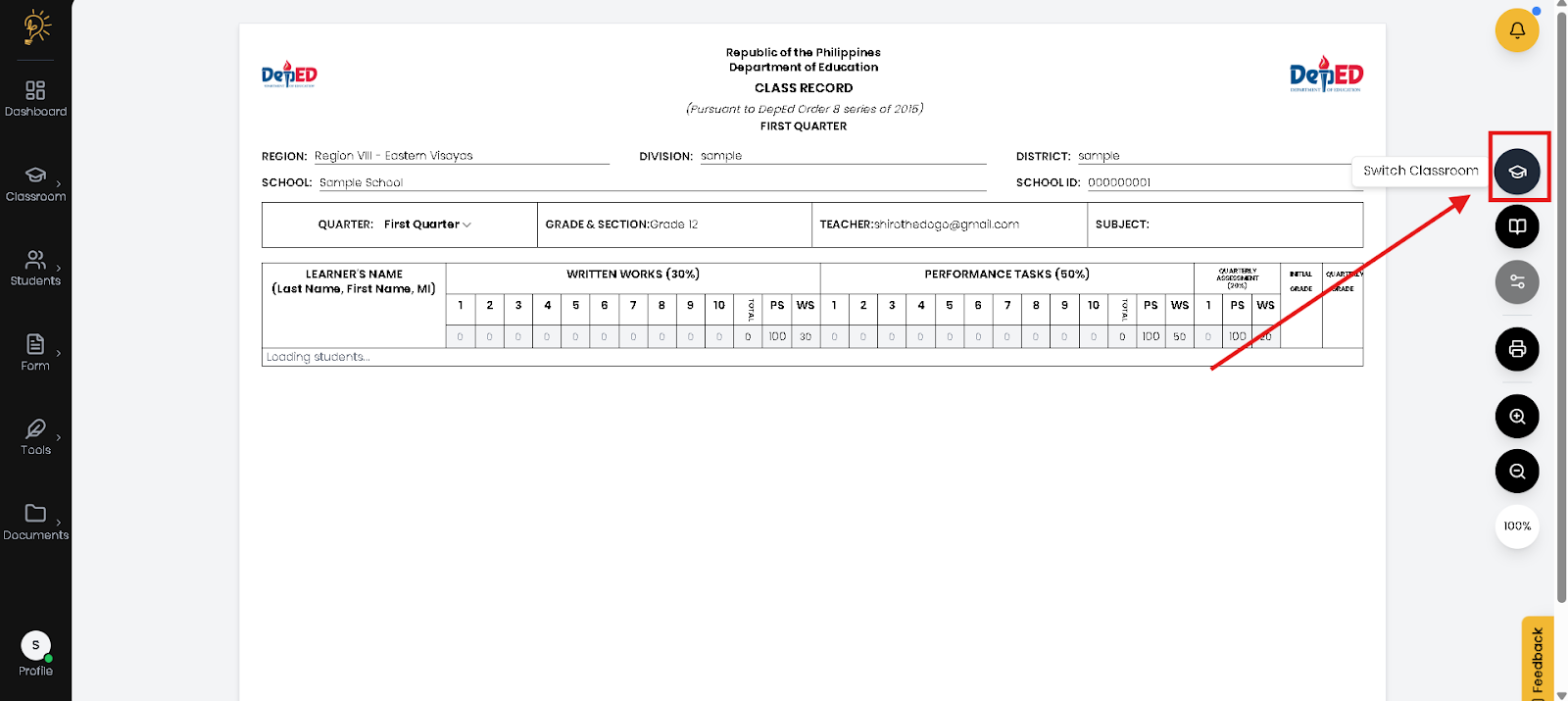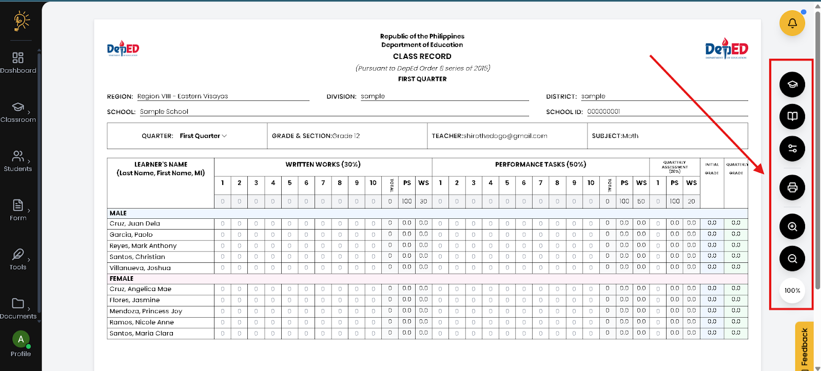 Using the on-screen buttons to switch classrooms and switch subjects, the class record updates instantly with the correct students and grading sheet. You can Configure grade weights, zoom in or out for easier viewing, and click Ready to Print to generate a DepEd-formatted class record—all without leaving the page.