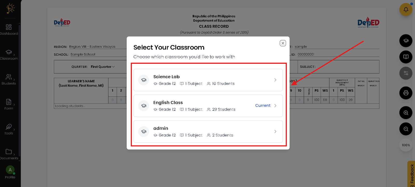 - Click Switch Classroom from the right-side panel and select the appropriate class.