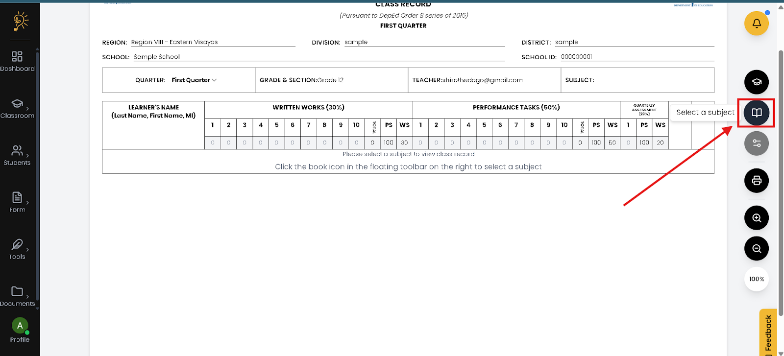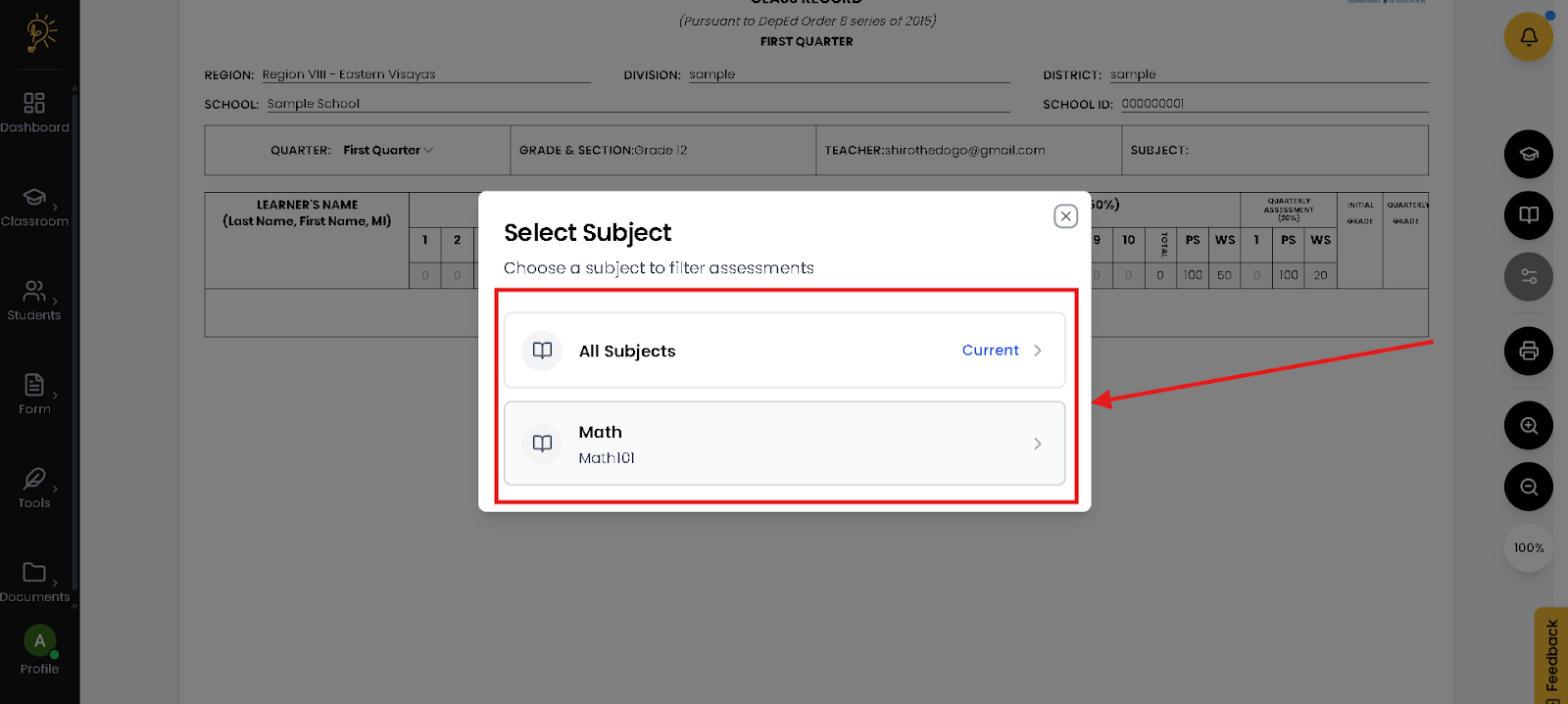 - It will appear in the list of subjects you handle. Select a specific to load the appropriate grading sheet for that class.
