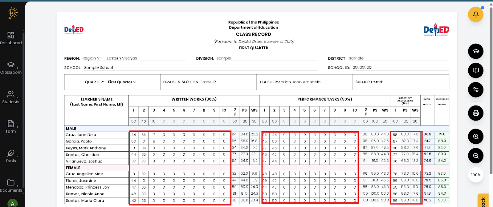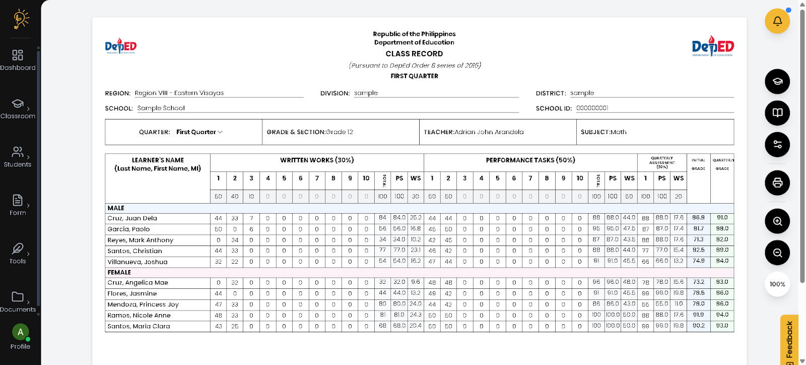 When you open the Class Record, you can immediately start entering and managing student scores for the selected class, subject, and grading period. As you input scores, the system automatically applies the correct grading components and updates the results in real time.