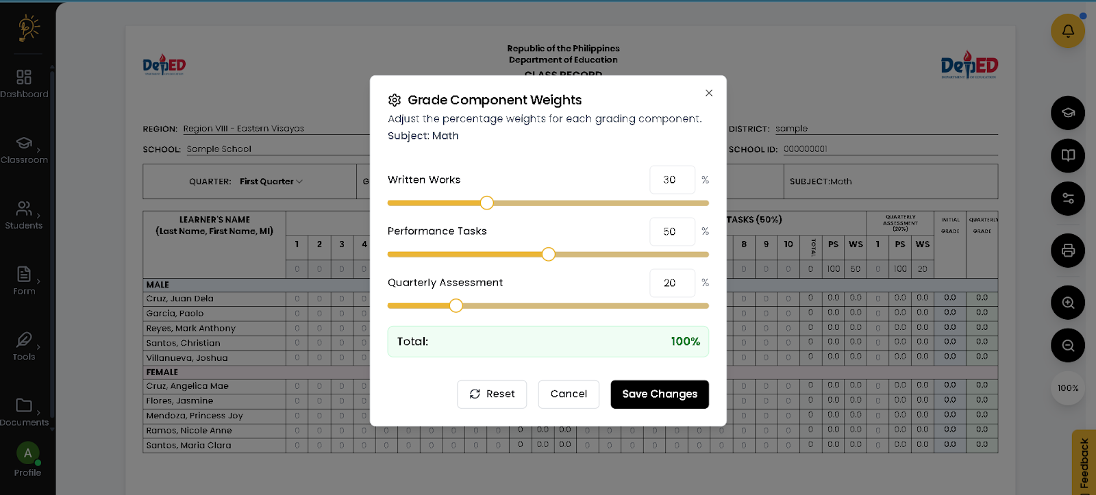 From the Class Record screen, click Configure Grade Weight to open the grading setup. Adjust the percentage values for each grading component according to your school’s policy, then save your changes. The class record will automatically recalculate all grades using the updated weights.