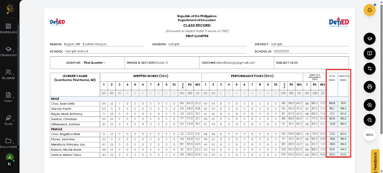 - Automatic Grade Computation – Instantly calculates Initial and Quarterly Grades as scores are entered.