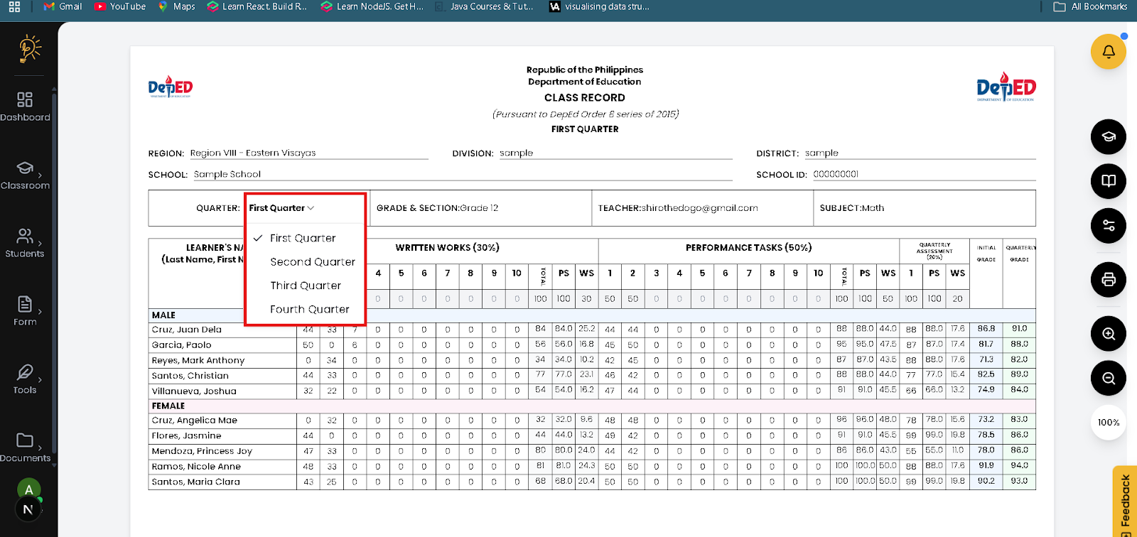 Use the Quarter dropdown to switch between grading periods, and the system will automatically display and compute grades based on the selected quarter.