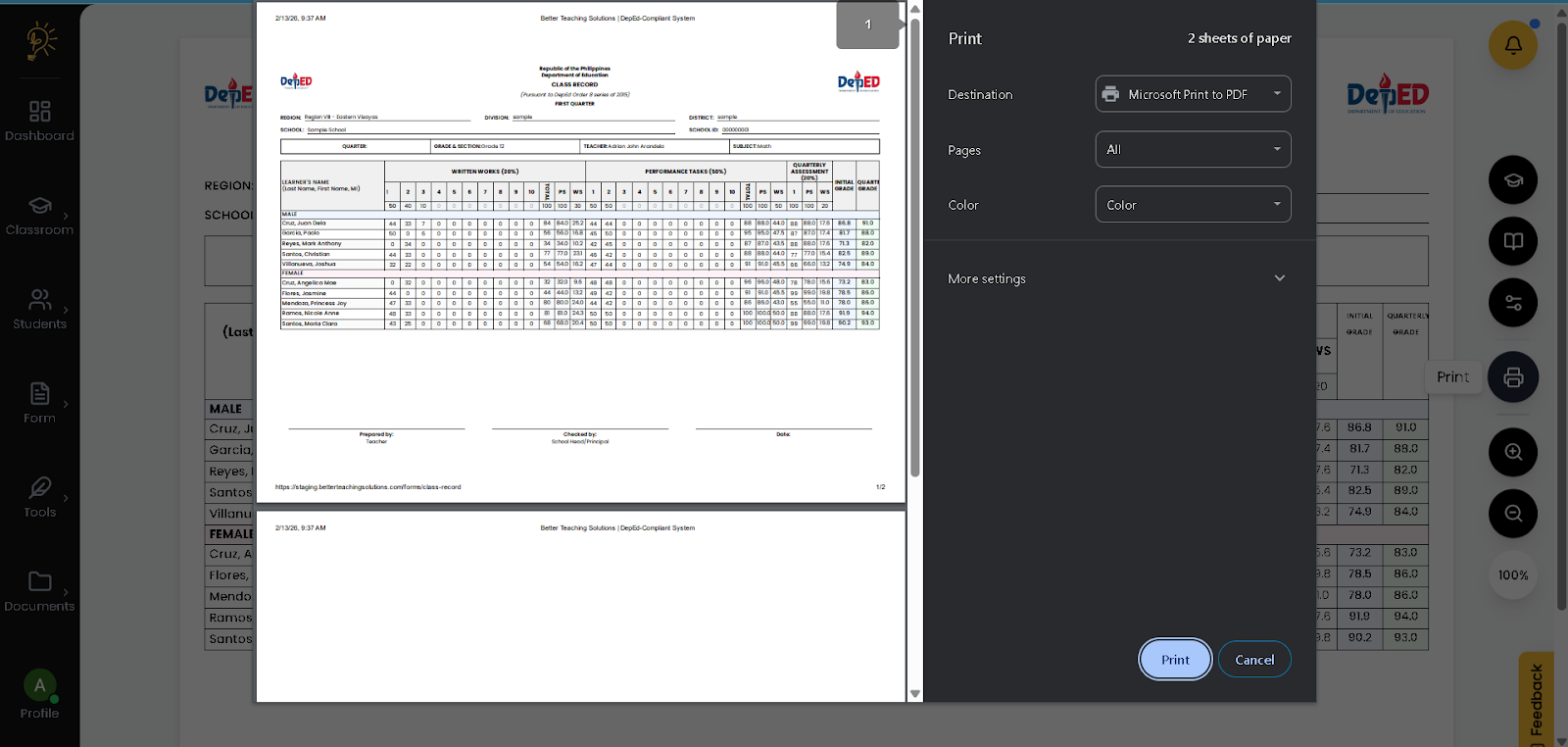 Use the Print feature to generate a clean, properly formatted version of your Class Record that removes menus and buttons, making it ready for submission or hard copy printing.