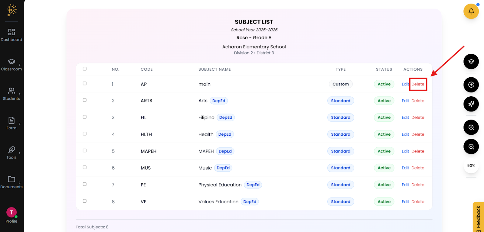 Deleting a subject is as simple as clicking a button. Located on the action column of the subjects table the right most side of a specified subject is the delete subject