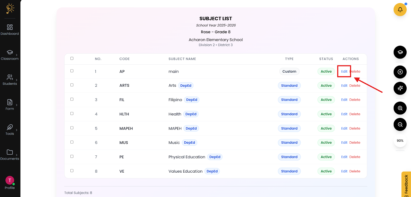 From the Dashboard, click the Classroom button located on the left side of the screen. Select Subjects from the menu to view and manage your subjects.