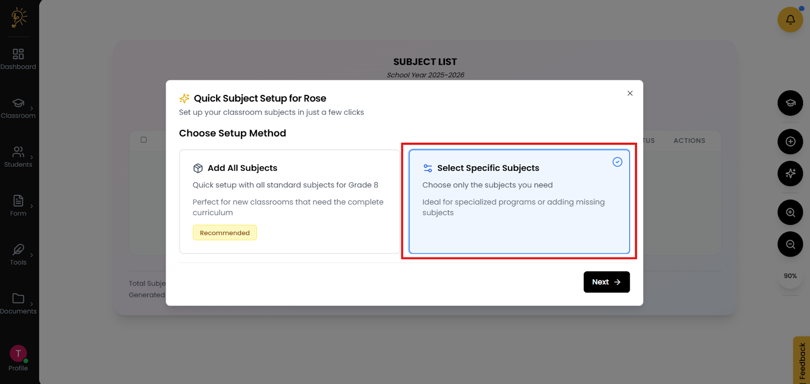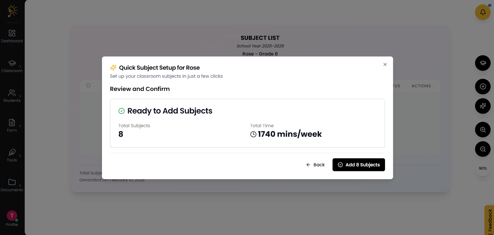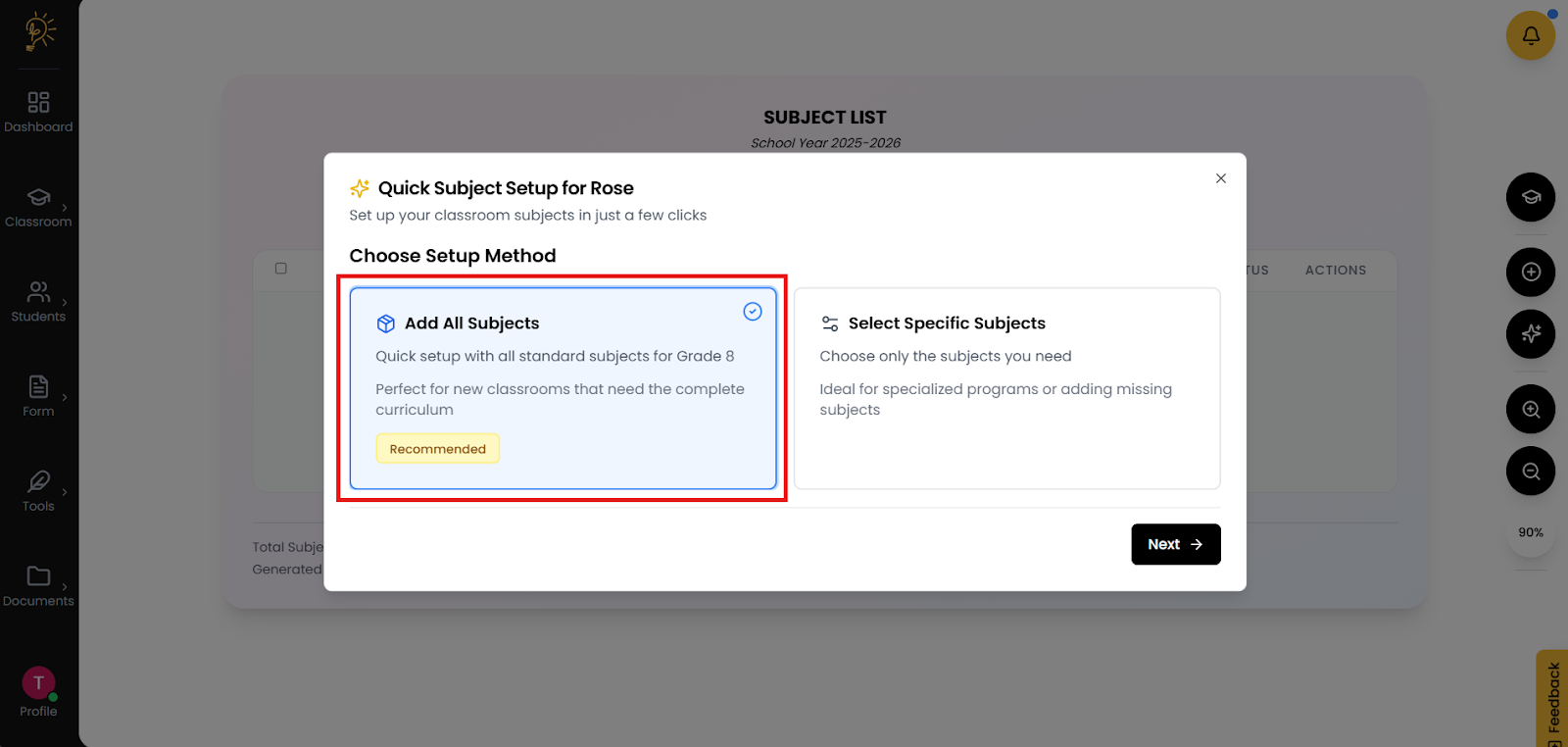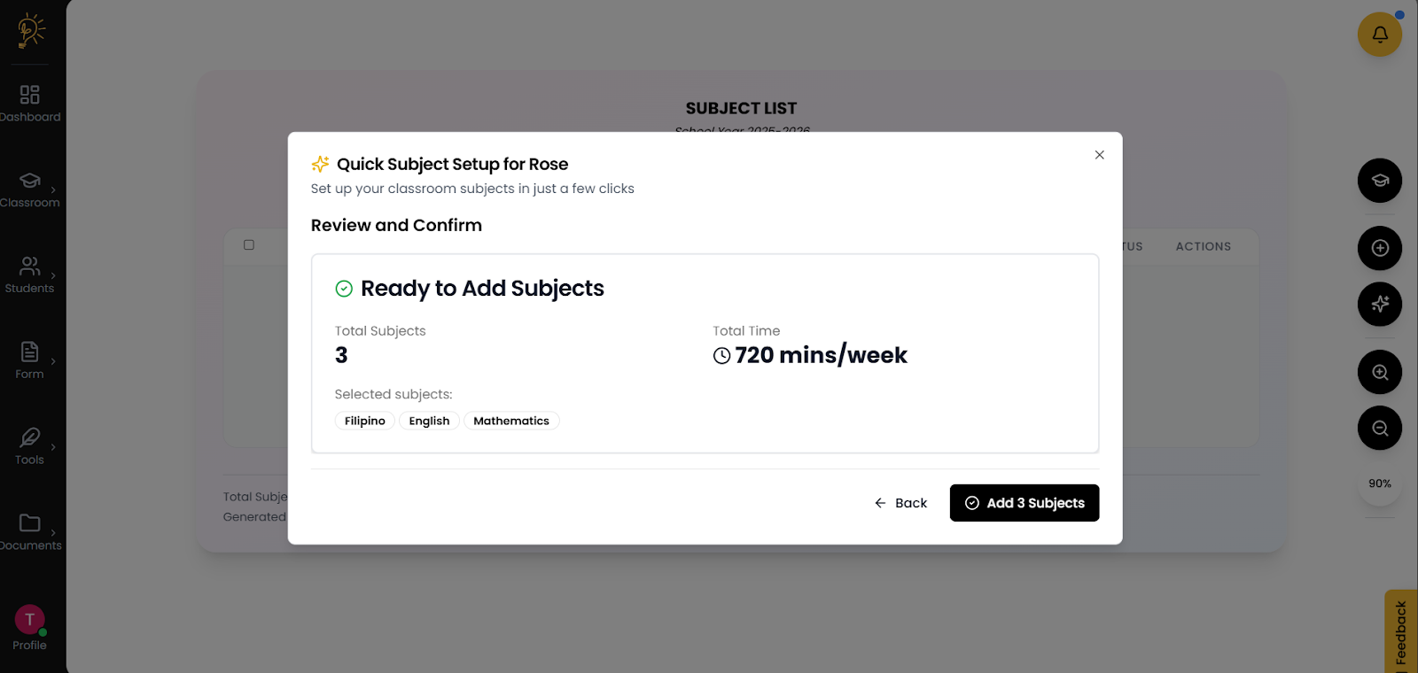 The Bulk Setup function allows you to efficiently add subjects using pre-made templates based on the standard DEPED curriculum. You can choose between two streamlined methods for populating your classroom: