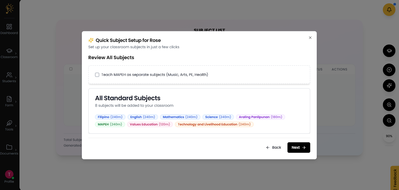 To set the standard curriculum, Click the All Standard Subjects button. If you prefer more control, you can enable the Teach MAPEH as a separate subjects checkbox. Activating this option automatically breaks the MAPEH block into four distinct subjects: Music, Arts, Physical Education (PE), and Health, allowing for individual management of each component.