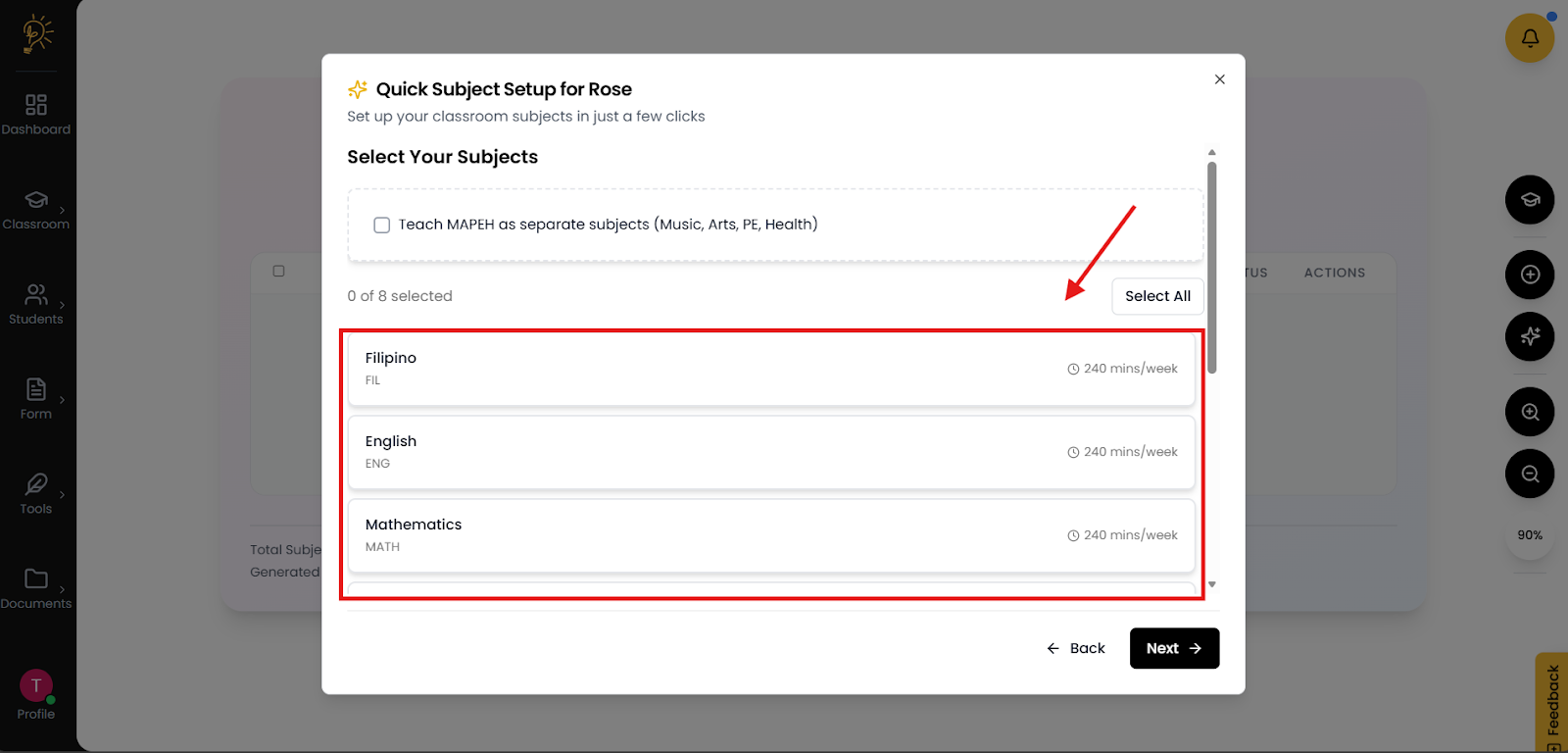 Clicking on a subject will highlight it, enabling you to select multiple entries simultaneously to fit your specific needs. You can also enable the Teach MAPEH as a separate subjects checkbox. Activating this option automatically divides the MAPEH block into four distinct subjects: Music, Arts, Physical Education (PE), and Health; this allows the component to be managed individually.
