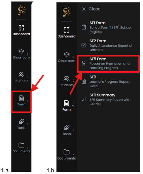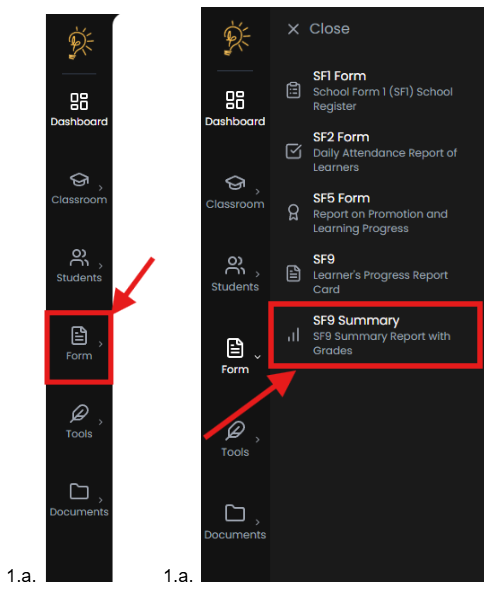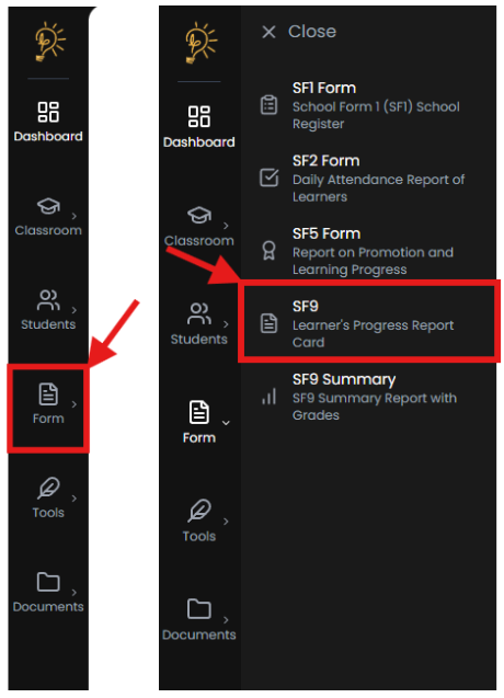 - Go to Forms → SF9 Report Card from the sidebar.