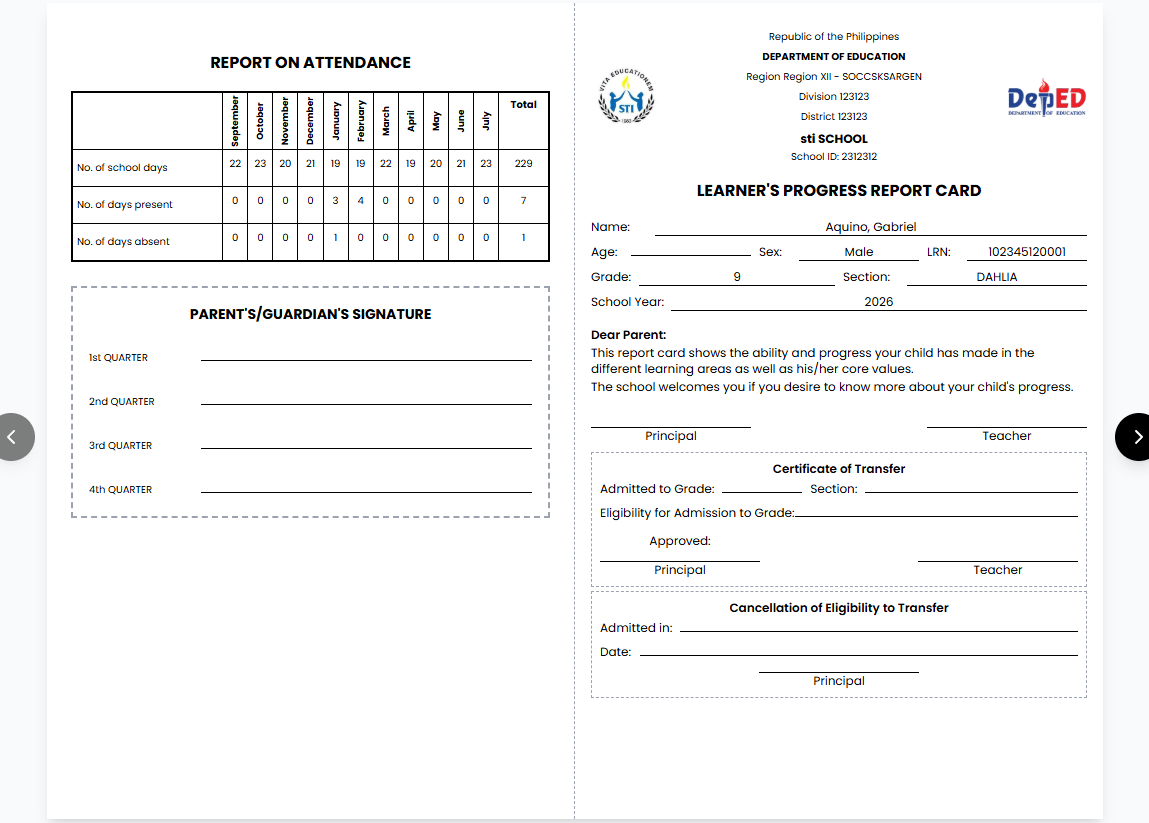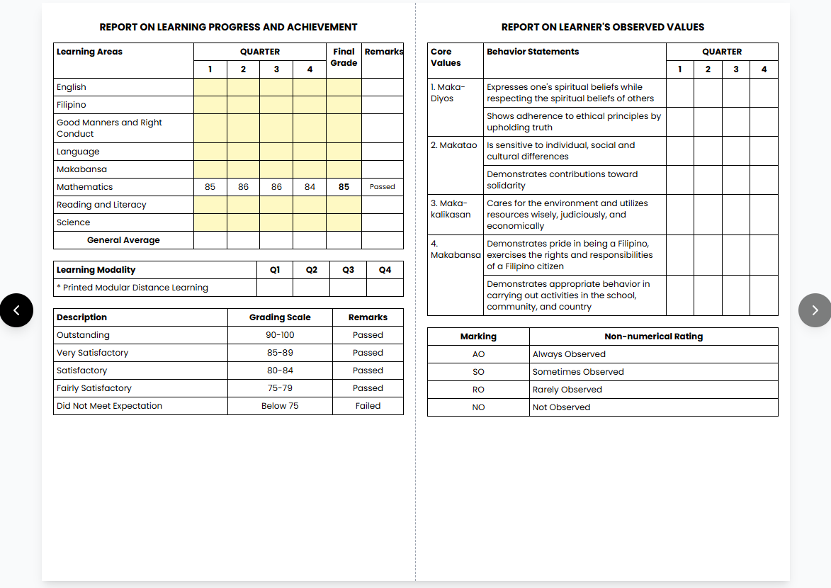 SF9 — Learner Progress Report Card
