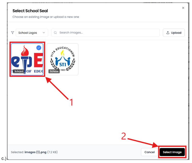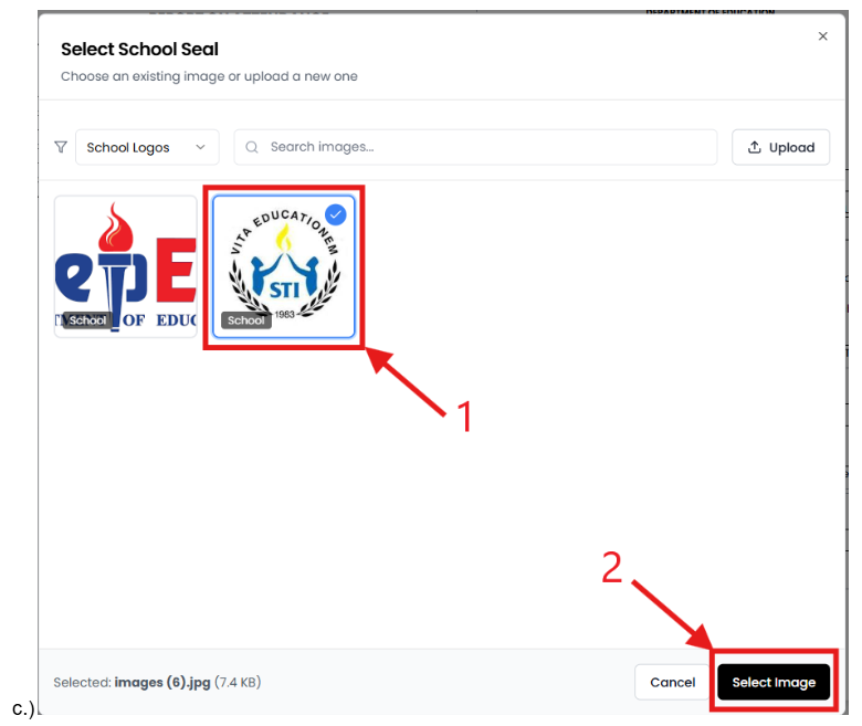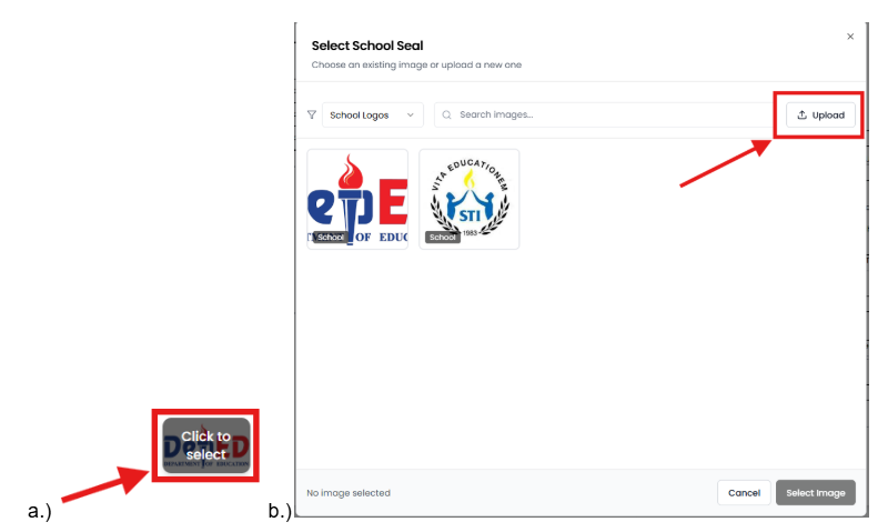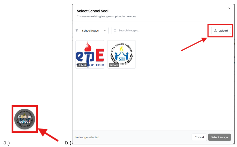 - Click the left placeholder for your school seal.