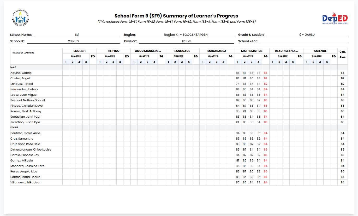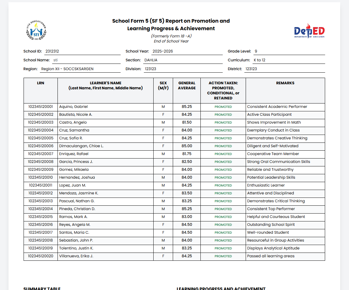 SF9 Summary — Class Summary of Grades