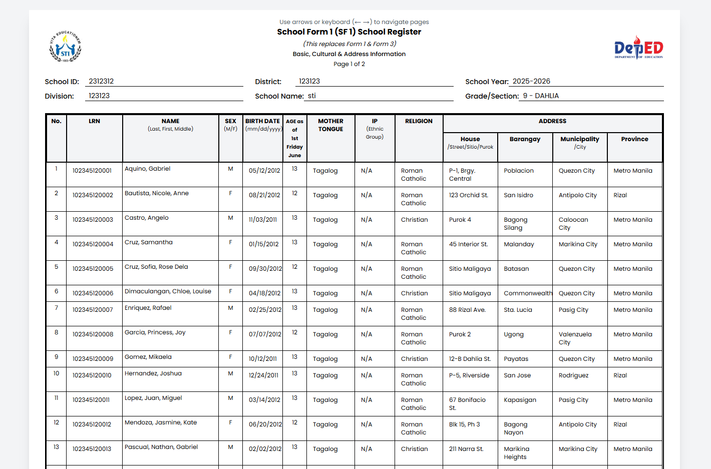 Includes LRN, name, sex, birth date, age, language, IP group, religion, and address.