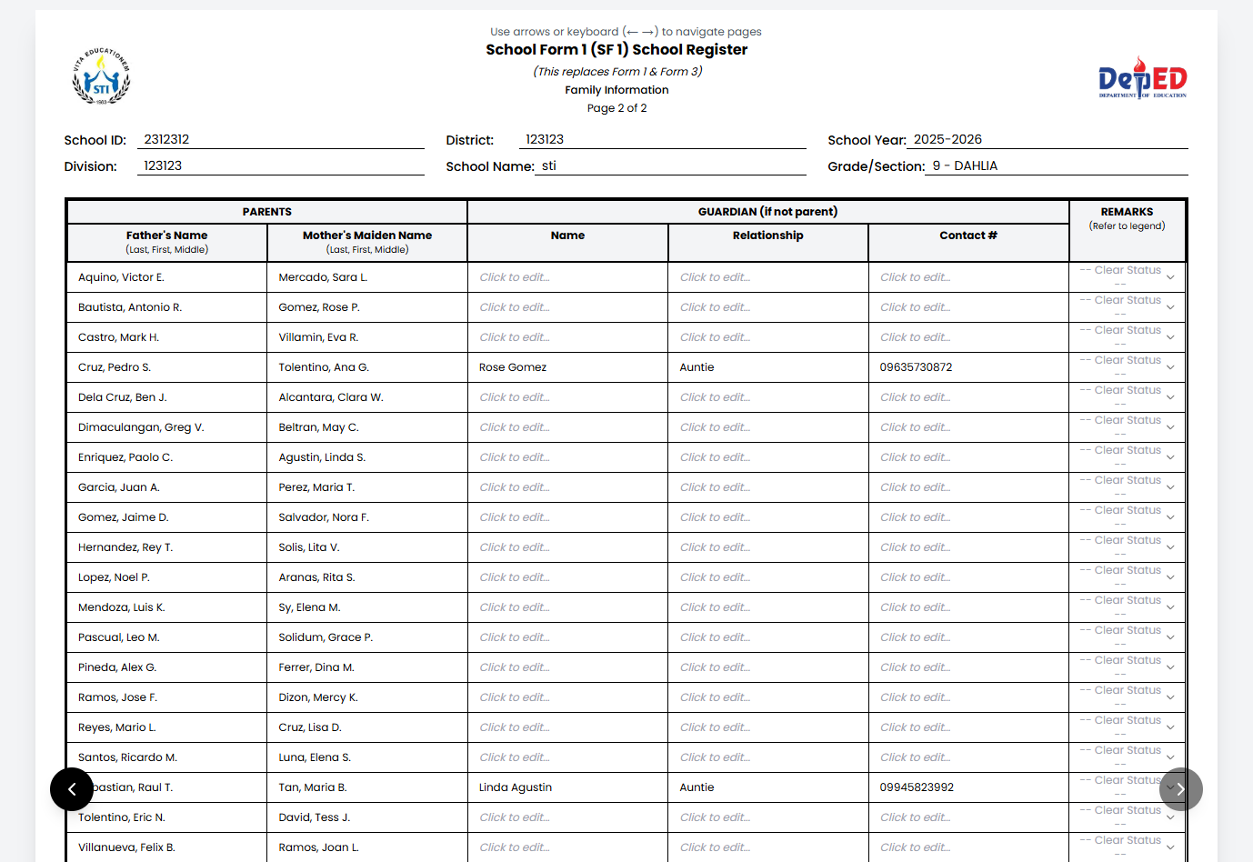 Includes parents’ names, guardian details, contact number, and remarks.