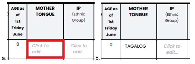 - Click the cell in the Remarks / Learning Areas column.