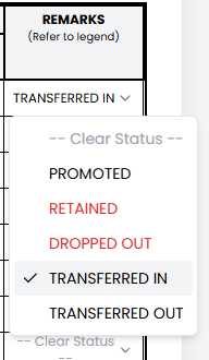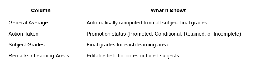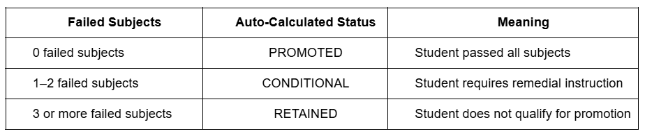 Promotion status is automatically calculated from the student’s Class Record. You do not need to compute or select it manually.