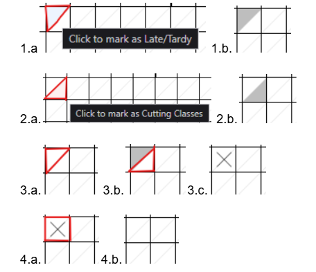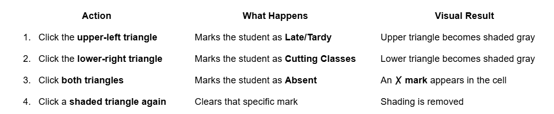 Each attendance cell is divided diagonally into two clickable triangles. You only interact with the cell when a student was late, cutting, or absent.
