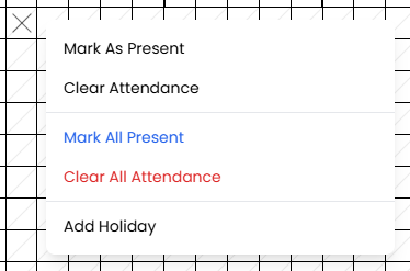 - Clear Attendance — removes attendance markings from the selected cell
