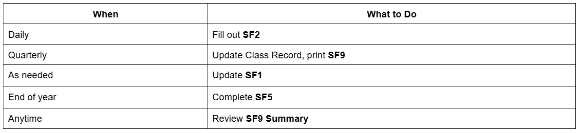 - Grades entered (for SF9 and SF5). Quarterly grades must be completed in the Class Record.